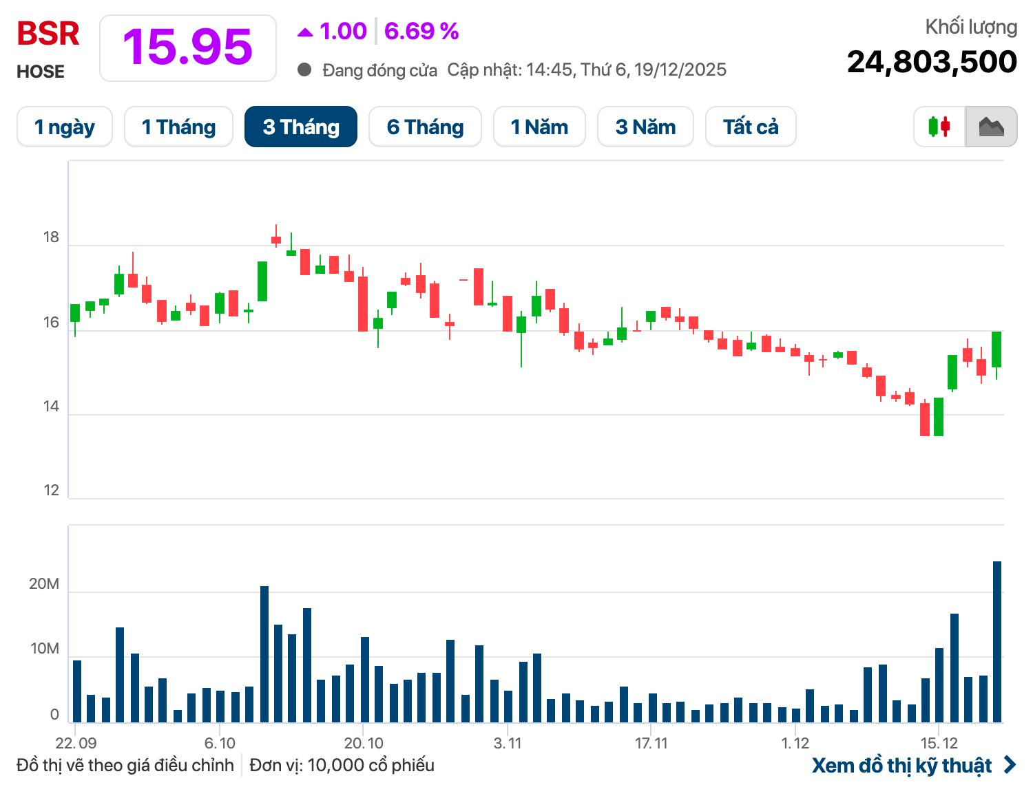 Trên thị trường chứng khoán, cổ phiếu BSR kết phiên 19/12 với mức giá trần là 15.950 đồng/cp, vốn hoá thị trường đạt gần 80.000 tỷ đồng.