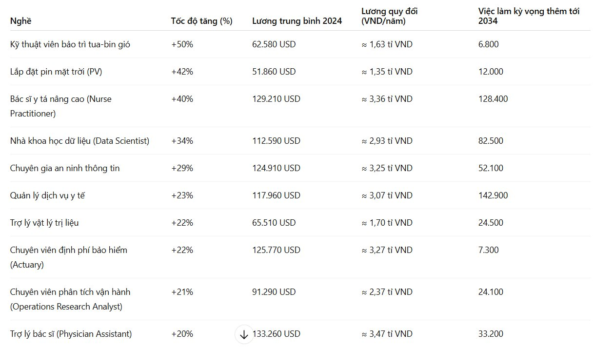 Dựa trên dữ liệu của BLS, dưới đây là 10 nghề tăng trưởng nhanh nhất đến năm 2034, kèm số việc làm mới dự kiến và thu nhập bình quân năm 2024. Một số công việc có mức lương lên đến 3,5 tỷ đồng/năm.