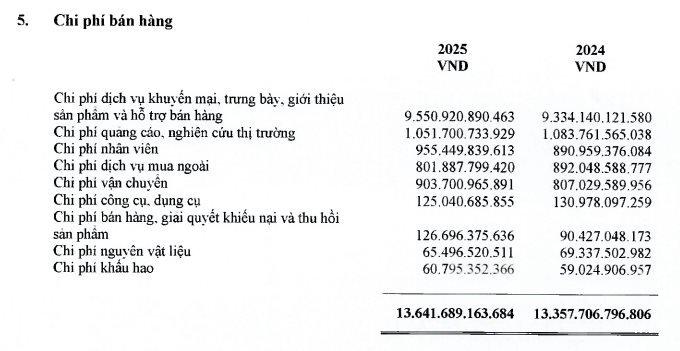 Theo báo cáo tài chính hợp nhất, cơ cấu chi phí năm 2025 cho thấy doanh nghiệp tiếp tục duy trì mức đầu tư lớn cho hoạt động bán hàng, với tổng chi phí đạt 13.641 tỷ đồng, tương đương khoảng 37,37 tỷ đồng/ngày, tăng 2,1% so với năm 2024.