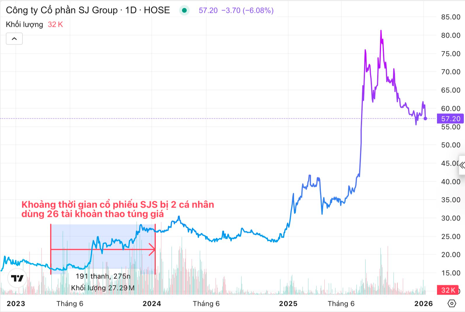 Trong khoảng thời gian từ ngày 10/4/2023 đến ngày 10/1/2024, cổ phiếu SJS tăng hơn 60% thị giá. Tuy nhiên, theo kết quả kiểm tra, tính toán cho thấy không có khoản thu trái pháp luật có được do thực hiện hành vi vi phạm của ông Nguyễn Ngọc Chiến và ông Trần Quang Cành.