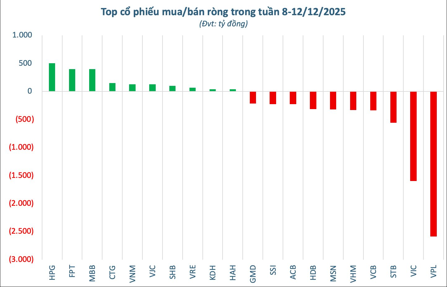 Thống kê theo từng mã chứng khoán cho thấy VPL là tâm điểm bị bán ròng mạnh nhất trong tuần, với giá trị lên tới 2.588 tỷ đồng, bỏ xa hoàn toàn các mã còn lại. Đứng thứ hai là VIC với mức bán ròng 1.597 tỷ đồng, tiếp theo là STB (557 tỷ đồng) và VCB (338 tỷ đồng). Nhiều cổ phiếu vốn hóa lớn khác cũng chịu áp lực rút vốn đáng kể như VHM (330 tỷ đồng), MSN (320 tỷ đồng), HDB (314 tỷ đồng), ACB (230 tỷ đồng), SSI (227 tỷ đồng) và GMD (217 tỷ đồng).