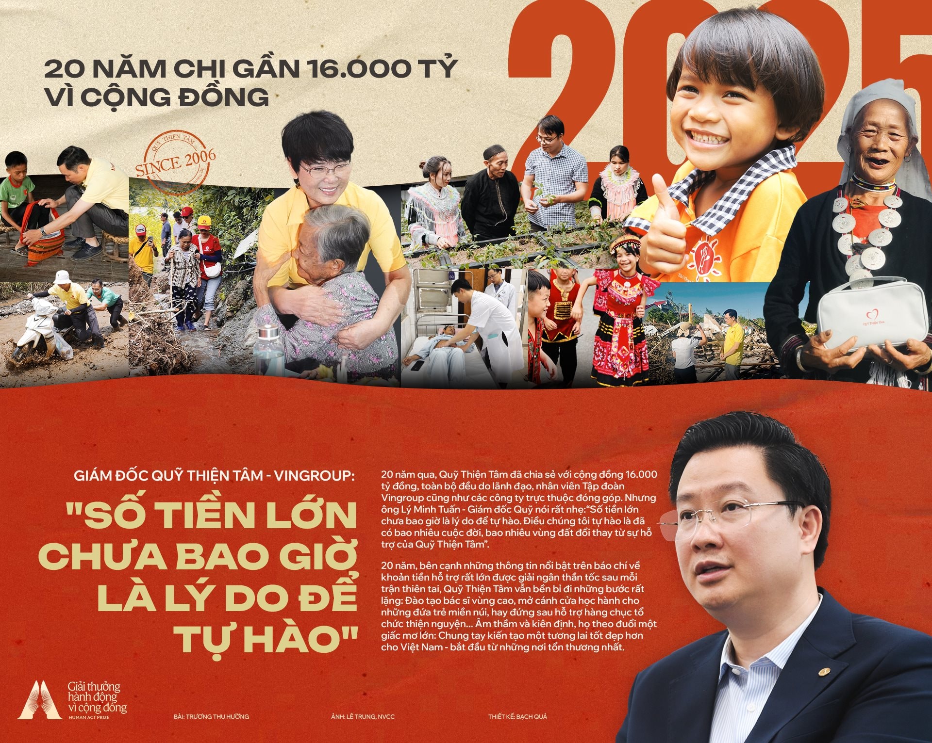 Tại Gala Giải thưởng Hành động vì cộng đồng – Human Act Prize 2025, Quỹ Thiện Tâm được vinh danh ở hạng mục Giải thưởng năm – Human Act Prize 2025, hạng mục cao nhất của giải. Đây là sự ghi nhận xứng đáng với hành trình bền bỉ gần 20 năm phụng sự cộng đồng của Quỹ.