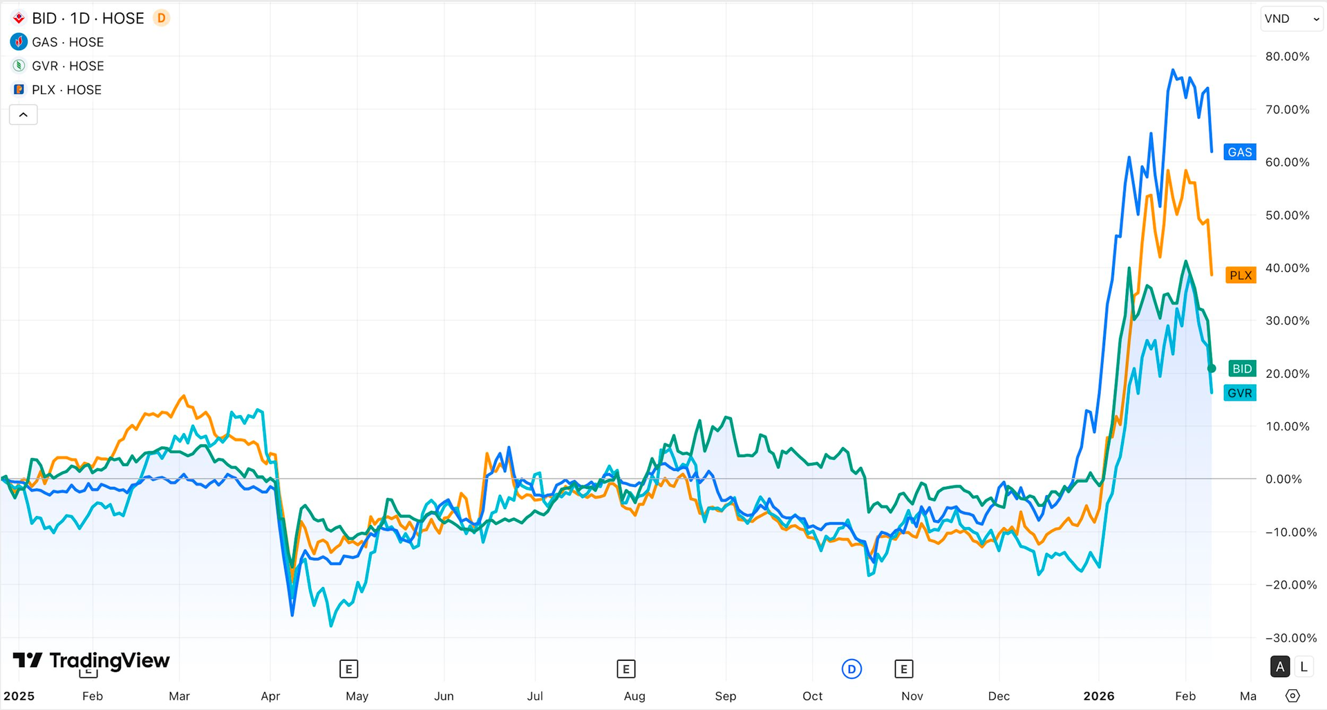 Áp lực chốt lời diễn ra sau giai đoạn các cổ phiếu này tăng nóng và neo cao vùng đỉnh. Dù giảm sàn phiên 10/2 nhưng thị giá BID, GAS, GVR và PLX vẫn cao hơn hàng chục % so với đầu năm. Trước đó, nhóm cổ phiếu DNNN đã nổi sóng nhờ cú hích từ Nghị quyết 79-NQ/TW về phát triển kinh tế chiến lược và kỳ vọng thoái vốn tránh rủi ro rời sàn.