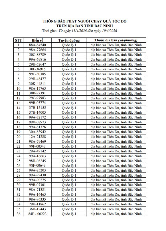 Công an tỉnh Bắc Ninh vừa công bố danh sách các phương tiện vi phạm chạy quá tốc độ trong tuần từ ngày 13/4/2026 đến ngày 19/4/2026. Cụ thể, qua phương tiện thiết bị kỹ thuật nghiệp vụ, Phòng Cảnh sát giao thông - Công an tỉnh Bắc Ninh, đã phát hiện 610 trường hợp vi phạm chạy quá tốc độ.