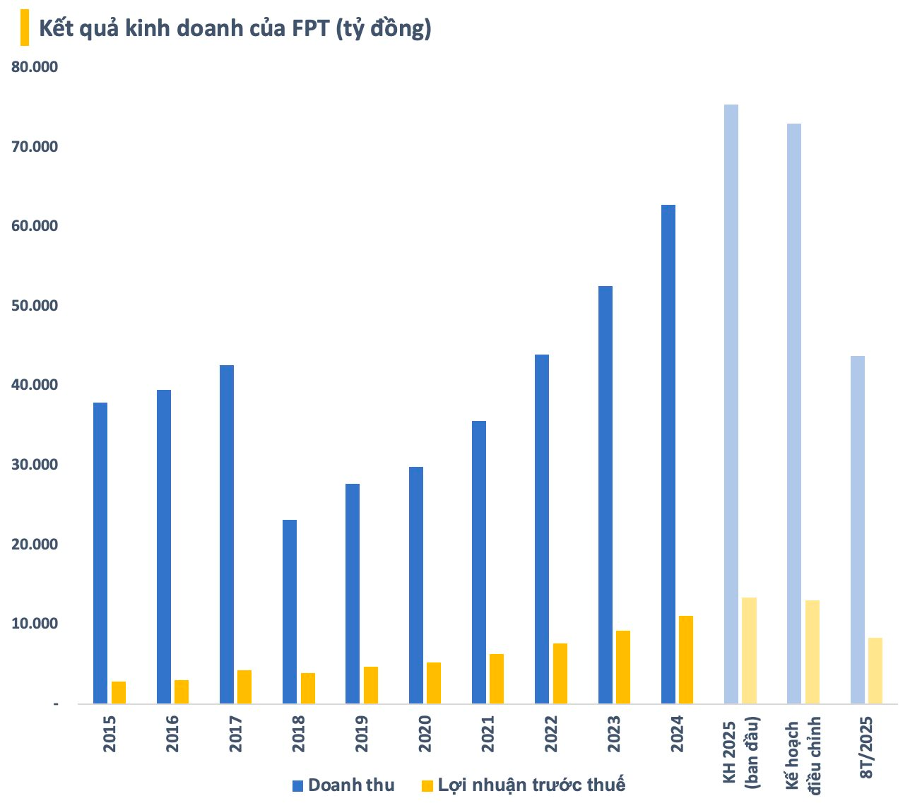 Ước tính theo kế hoạch mới, FPT đặt mục tiêu doanh thu và LNTT năm 2025 lần lượt khoảng 73.000 tỷ đồng và 13.000 tỷ đồng.