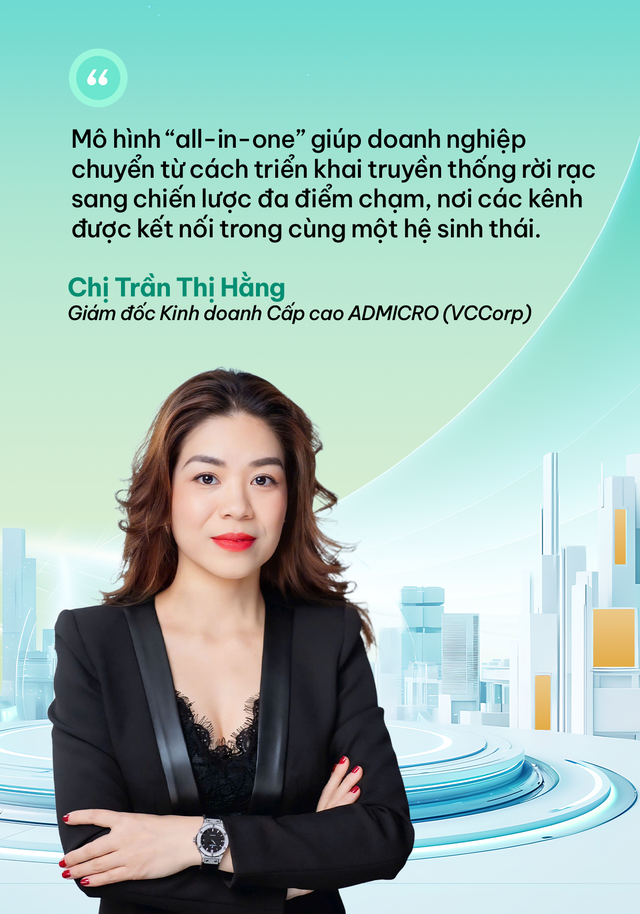 Chị Trần Thị Hằng: Mô hình "all-in-one" giúp doanh nghiệp chuyển từ cách triển khai truyền thống rời rạc sang chiến lược đa điểm chạm, nơi các kênh được kết nối trong cùng một hệ sinh thái. Thay vì quản lý và tối ưu từng nền tảng riêng lẻ, doanh nghiệp có thể theo dõi và tối ưu hiệu quả trên toàn bộ hành trình truyền thông, từ đó nâng cao hiệu quả tổng thể của chiến dịch.