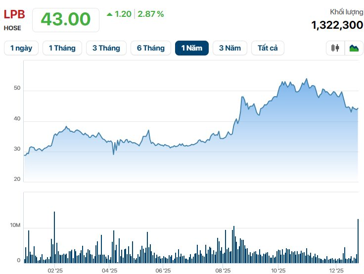 Trước đó, LPB bay 5% tại phiên 23/12 sau thông tin ông Nguyễn Đức Thụy từ nhiệm chức danh Chủ tịch HĐQT đồng thời rút khỏi HĐQT của LPBank. Cùng với đó, cá nhân liên quan là ông Nguyễn Văn Thùy (tức em trai ông Thụy) cũng từ nhiệm chức danh Phó chủ tịch HĐQT LPBank.