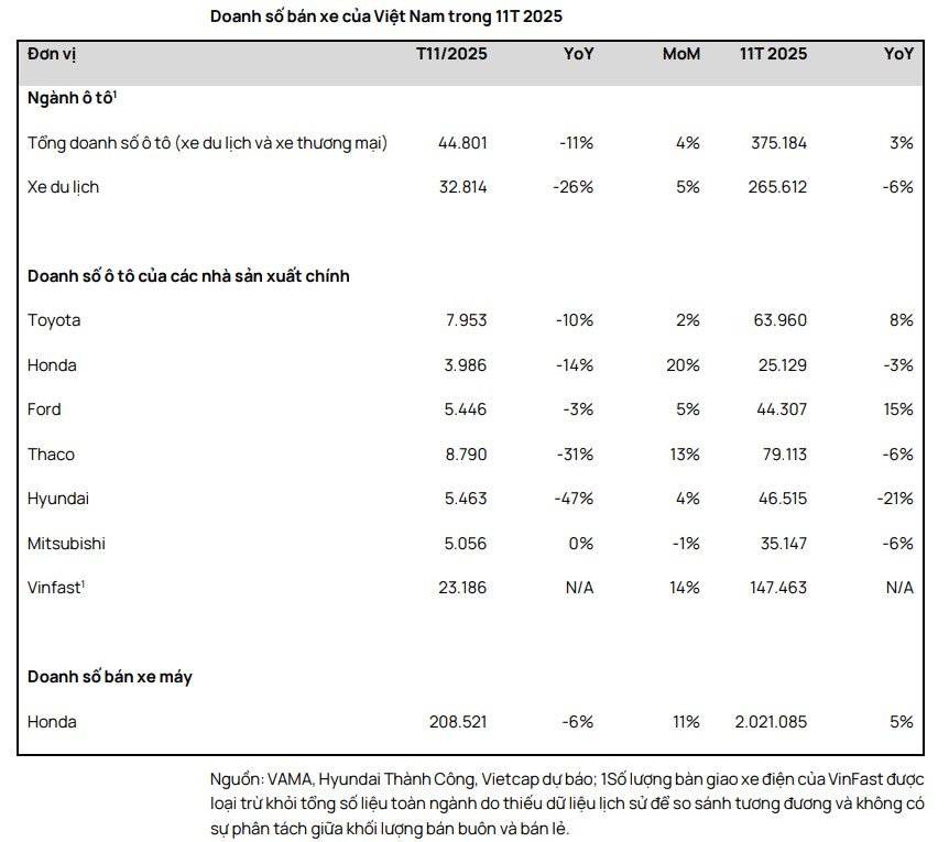 Dưới áp lực này, nhiều thương hiệu xe động cơ đốt trong truyền thống đã ghi nhận sụt giảm doanh số trong 11 tháng năm 2025 – doanh số của Honda giảm 3% so với cùng kỳ năm trước từ mức nền cao cuối năm 2024, trong khi cả Thaco và Mitsubishi đều giảm 6% so với cùng kỳ năm trước và Hyundai giảm 21% so với cùng kỳ năm trước.