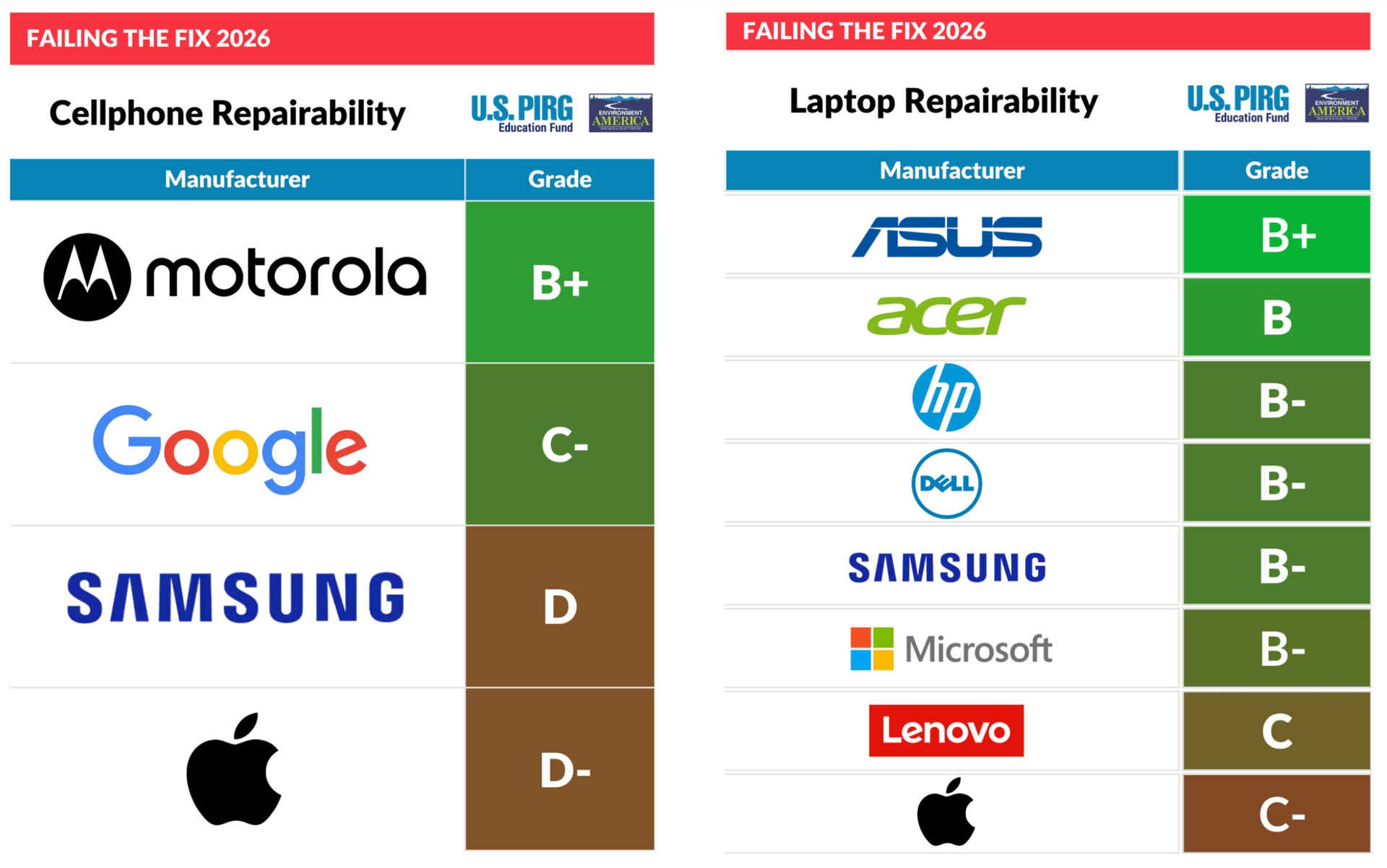 Bảng xếp hạng mới nhất về khả năng sửa chữa nằm trong báo cáo thường niên có tên gọi “Thất bại trong việc Sửa chữa” (Failing The Fix 2026) được nhóm vận động bảo vệ người tiêu dùng US PIRG công bố ngày 7/4 vừa qua.