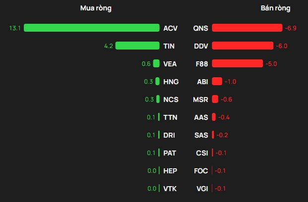 Chiều mua, cổ phiếu ACV được khối ngoại mua 13 tỷ đồng. Theo sau, TIN và VEA cũng được mua ròng mỗi mã vài trăm triệu đồng.