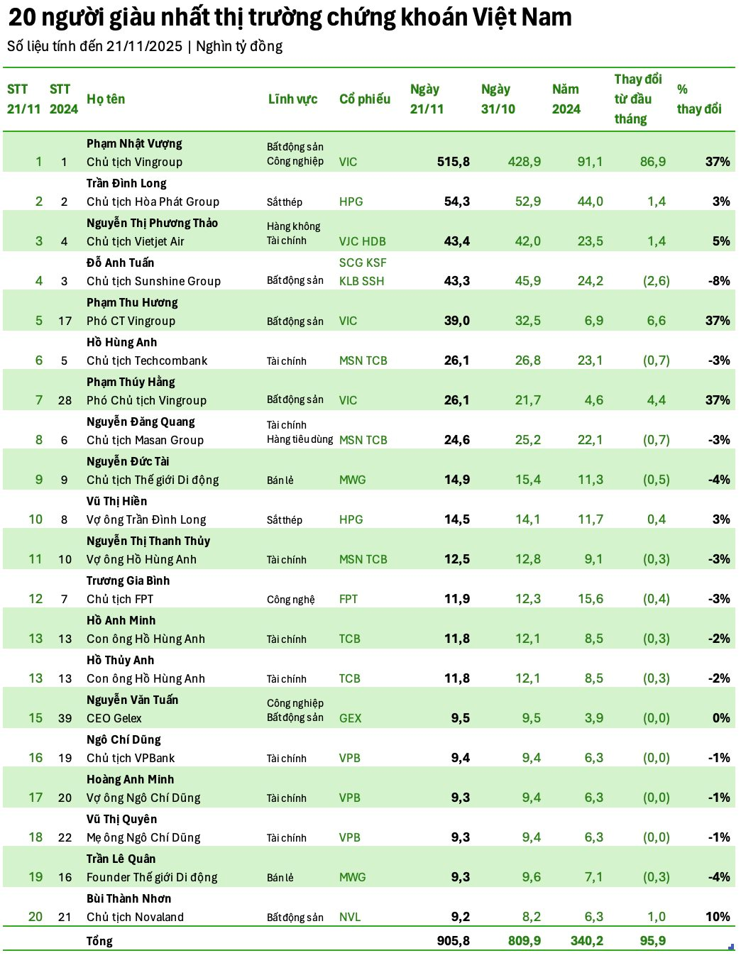 Tính đến ngày 21/11/2025, tổng tài sản của 20 người giàu nhất thị trường chứng khoán Việt Nam đạt mức 905.800 tỷ đồng, tăng khoảng 95.900 tỷ đồng so với đầu tháng và tăng 565.600 tỷ đồng so với đầu năm.