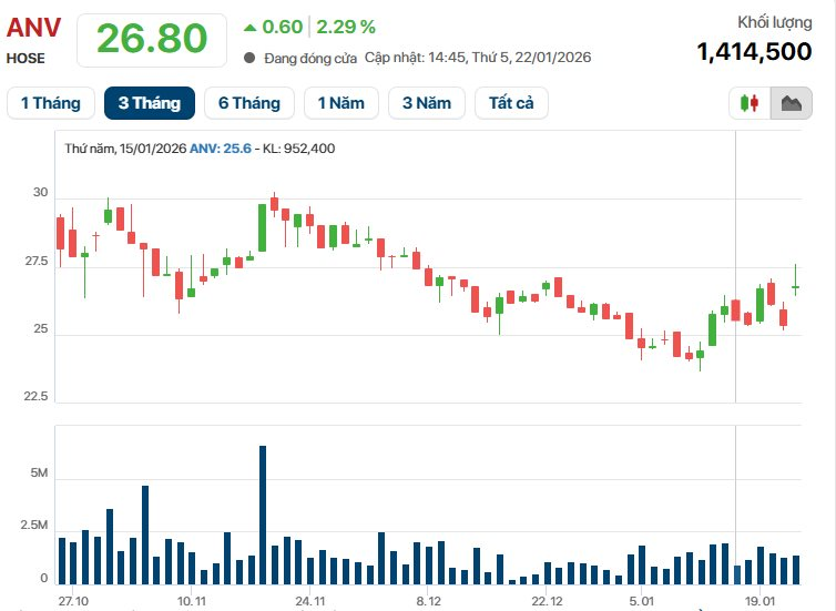 Kết phiên giao dịch ngày 22/1/2025, giá cổ phiếu ANV đóng cửa ở mức 26.800 đồng/cổ phiếu, tăng 2,3%.