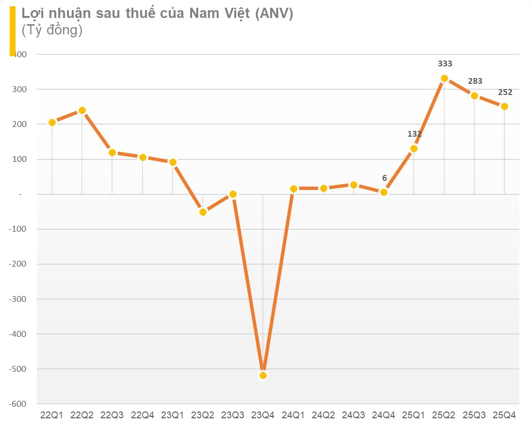 ANV lãi sau thuế trong quý 4 đạt gần 252 tỷ đồng, gấp 42,5 lần so với mức lãi chỉ gần 6 tỷ đồng của quý 4/2024.