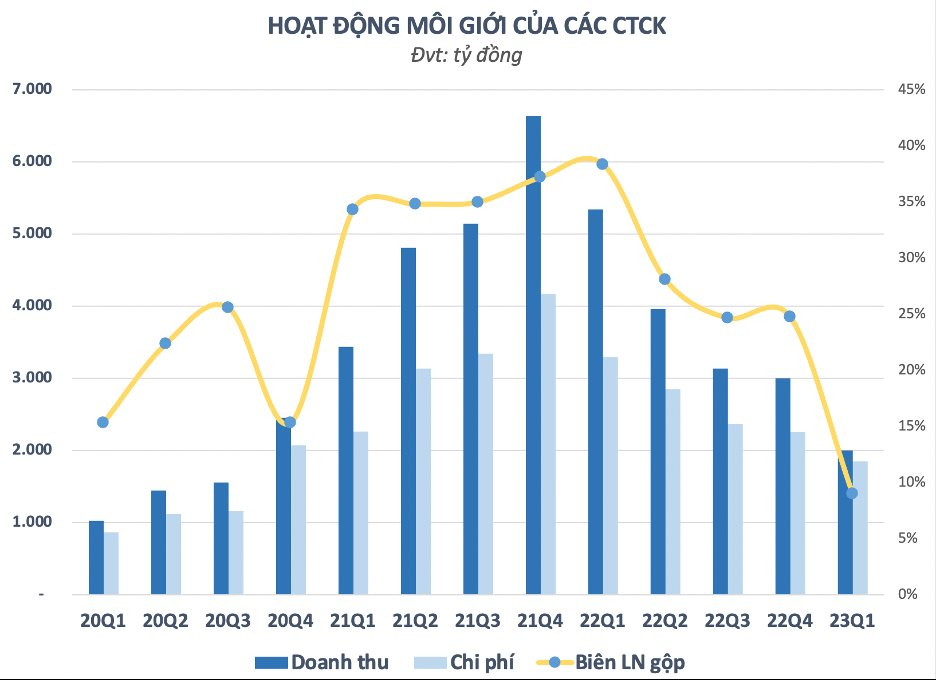 Cụ thể hơn, doanh thu mảng môi giới quý 1/2023 của các công ty chứng khoán đã giảm mạnh so với giai đoạn bùng nổ trong quý 4/2021, như VPS (-63%), SSI (-68%), VND (-73%), HSC (-64%), Mirae Asset (-61%)…