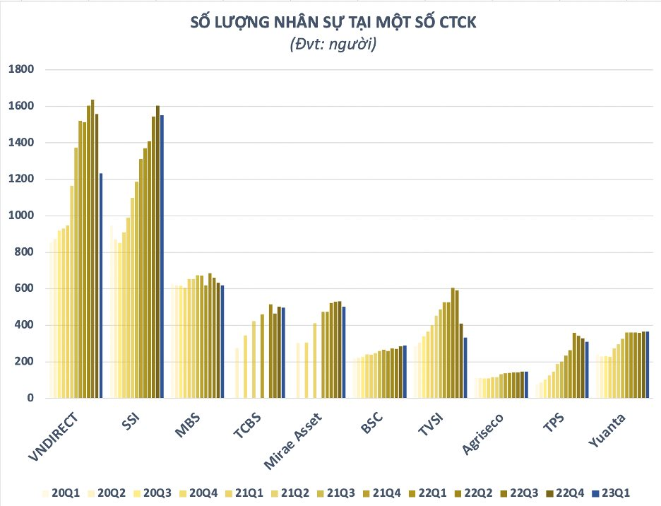 Thống kê tại 19 công ty chứng khoán, tổng số nhân sự cuối quý 1/2023 ghi nhận 8.324 người, giảm gần 380 người so với đầu năm. Nếu so với thời kỳ bùng nổ vào quý 2/2022, ước tính tổng nhân sự của các công ty chứng khoán đã giảm trên nghìn người. Cần lưu ý, con số trên chỉ bao gồm những công ty chứng khoán công bố dữ liệu, số lượng nhân sự sụt giảm trên thực tế có thể cao hơn ước tính, chưa kể một lượng lớn cộng tác viên môi giới cũng nghỉ việc khó có thể thống kê.