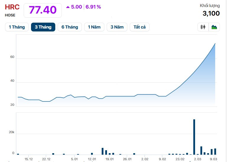 Tính từ phiên 11/2, cổ phiếu này đã duy trì chuỗi 15 phiên tăng kịch biên độ trên sàn HOSE. So với mức giá 28.450 đồng hồi đầu tháng 2, thị giá HRC đã tăng 172%.