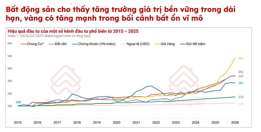“Dữ liệu 10 năm cho thấy bất động sản là kênh tích lũy giá trị bền vững, ít bị chi phối bởi các cú sốc ngắn hạn hơn so với vàng hay chứng khoán. Giá trị của bất động sản đến từ nhu cầu ở thực luôn tồn tại, sự cải thiện của hạ tầng và quá trình đô thị hóa kéo dài", ông Bạch Dương nhận định.