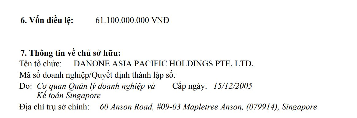 Theo dữ liệu, công ty này được thành lập từ tháng 4/2023. Khi đó, chủ sở hữu doanh nghiệp là Danone Asia Pacific Holdings Pte. Ltd, là pháp nhân tại Singapore của tập đoàn Pháp. Vốn điều lệ lúc thành lập là 61,1 tỷ đồng. Thời điểm này, Tổng giám đốc là Lusiana Eva, quốc tịch Indonesia.