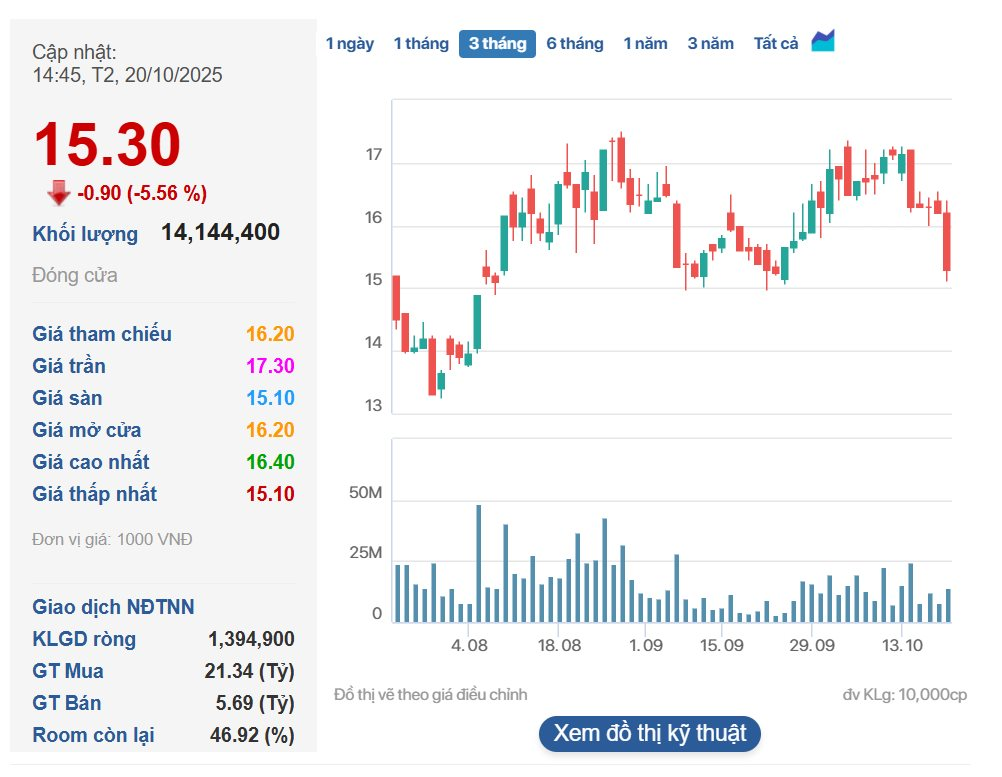 Kết thúc phiên giao dịch hôm nay 20/10, giá cổ phiếu của HAG đạt 15.300 đồng/cổ phiếu, giảm 5,56%.