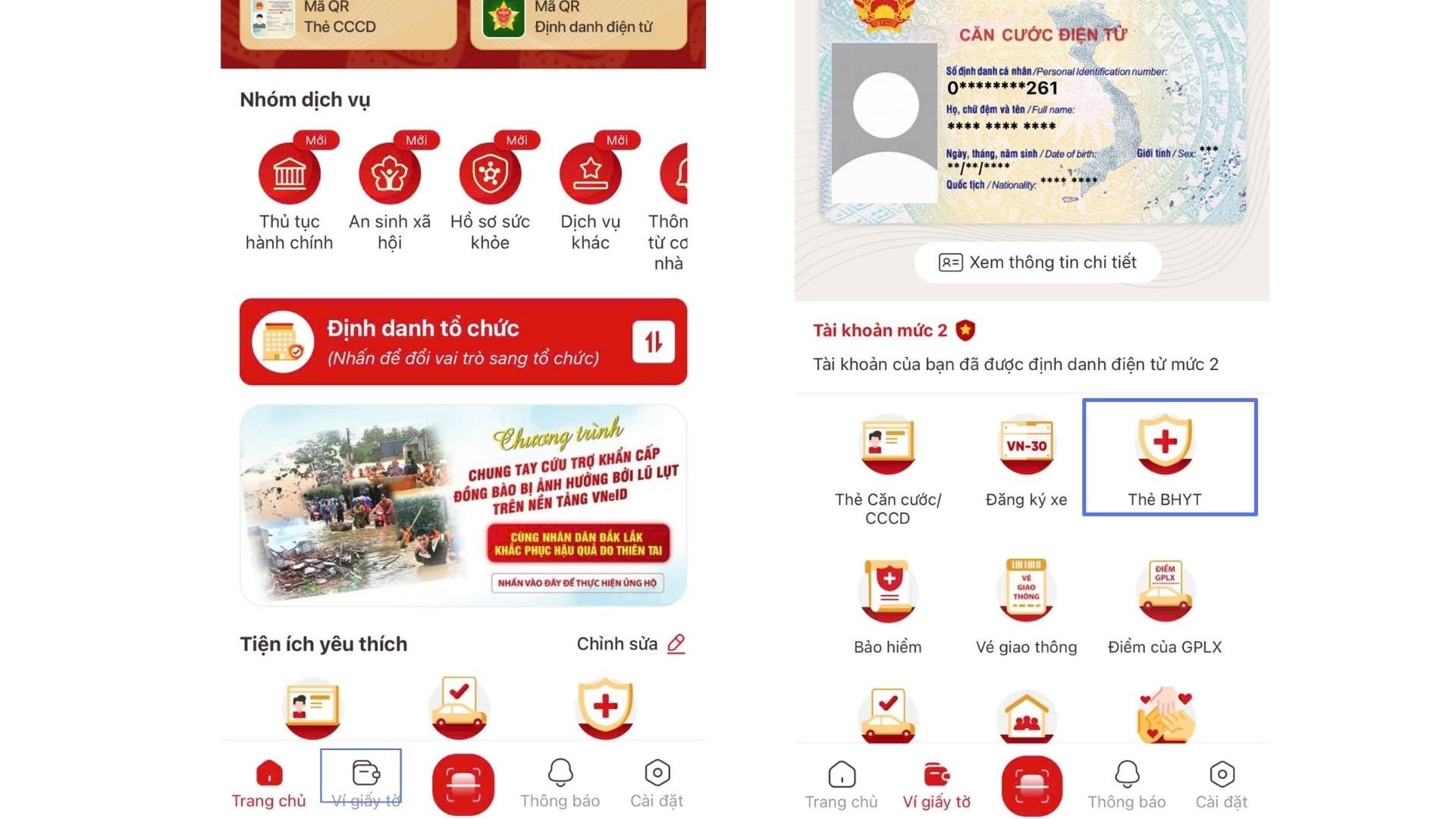 Bước 2: Tại màn hình giao diện nhấn chọn “Ví giấy tờ”, chọn “Thẻ BHYT”.