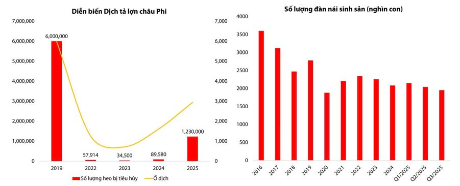 Phân tích về triển vọng giá thịt heo dịp cuối năm, bà Lê Thụy Tường Vy, Analyst từ Trung tâm phân tích của Chứng khoán Rồng Việt (VDSC) cho biết tính đến hết tháng 11/2025, số lượng heo bị tiêu hủy do dịch tả lợn châu Phi (DTLCP) đạt 1,23 triệu con, tương đương hơn 4% tổng đàn.