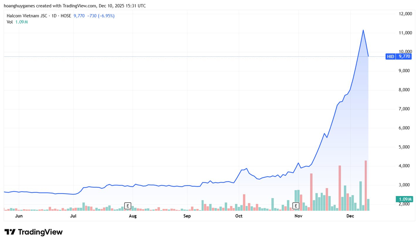 Kết thúc phiên giao dịch ngày 10/12/2025, cổ phiếu HID của CTCP Halcom Việt Nam giảm kịch biên độ 6,95% về mức 9.770 đồng/cp. Đây là phiên giảm thứ hai liên tiếp, chấm dứt chuỗi 14 phiên tăng điểm trước đó. Tính từ mức đỉnh 11.150 đồng thiết lập ngày 8/12, thị giá HID đã điều chỉnh 12,4%.