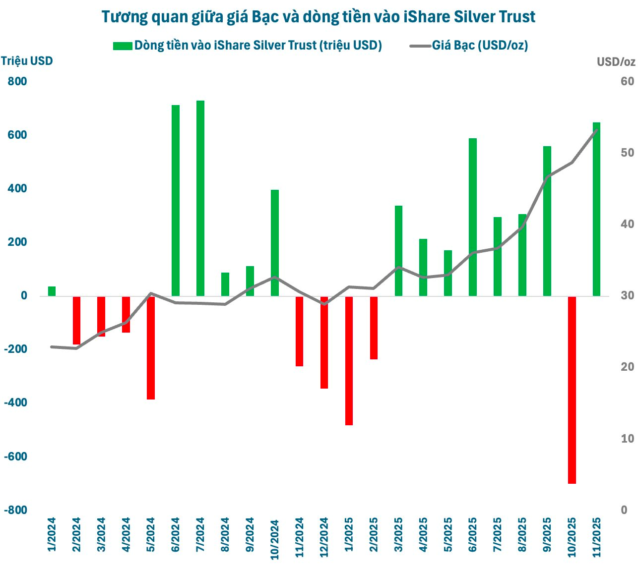 Luỹ kế từ đầu năm 2025, quỹ Bạc lớn nhất thế giới đã chi 1,7 tỷ USD để mua khoảng 32 triệu oz Bạc (1 nghìn tấn). Tính đến thời điểm hiện tại, iShare Silver Trust đang nắm giữ tổng cộng hơn 500 triệu oz Bạc (khoảng 15.600 tấn).