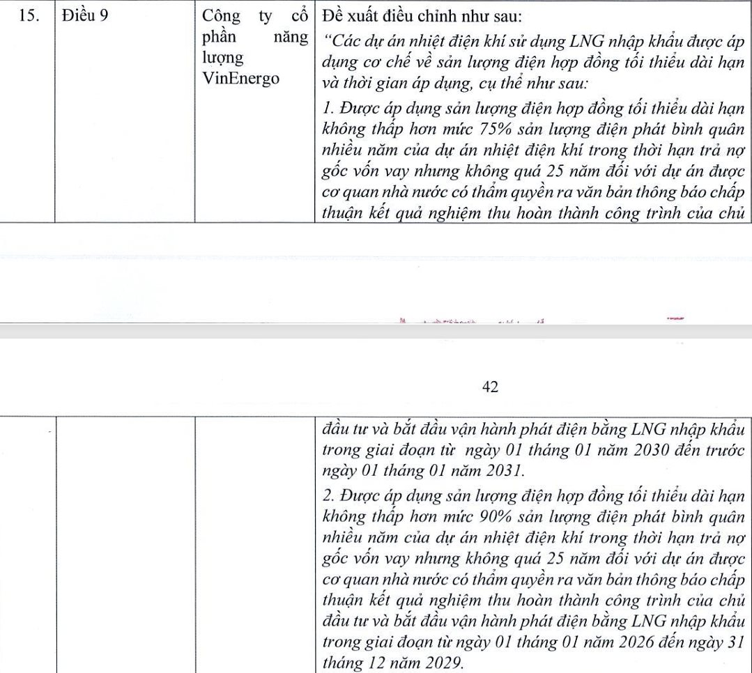 VinEnergo thuộc hệ sinh thái Vingroup đã có góp ý về dự thảo này. Cũng với con số 75%, VinEnergo đề xuất thời hạn là không quá 25 năm (so với dự thảo là không quá 10 năm), dành cho các dự án bắt đầu vận hành phát điện bằng LNG nhập khẩu vận hành từ 1/1/2030 tới 31/12/2031.