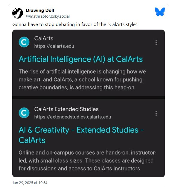 Câu chuyện về một sinh viên ngành điện ảnh tại Đại học Alaska Fairbanks đã phá hủy tác phẩm triển lãm nghi là do AI tạo ra bằng cách... ăn nó ngay tại chỗ, hay những cuộc biểu tình tại CalArts với những tờ rơi chống AI phủ kín khuôn viên trường đã phác họa một bức tranh đầy bất ổn.