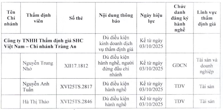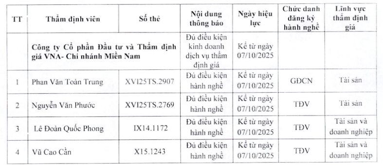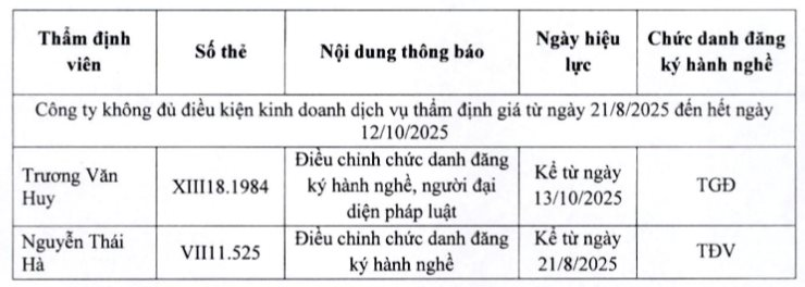 Từ đề xuất của các doanh nghiệp thẩm định giá và việc rà soát, điều chỉnh danh sách thẩm định viên về giá hành nghề tại các doanh nghiệp, Bộ Tài chính đã điều chỉnh thông tin về thẩm định viên đăng ký hành nghề năm 2025 tại 3 doanh nghiệp thẩm định giá.