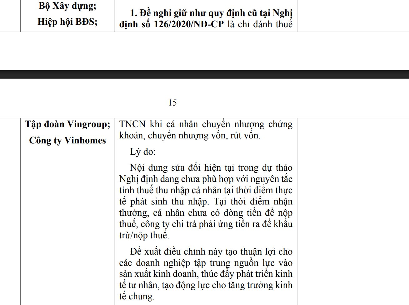 Bộ Xây dựng, Vingroup (HoSE: VIC), Vinhomes (HoSE: VHM), Techcombank (HoSE: TCB), Masan (HoSE: MSN) có chung ý kiến về thay đổi này, đó là giữ nguyên quy định cũ (thu thuế khi chuyển nhượng chứng khoán, rút vốn, chuyển nhượng vốn, cổ phần).