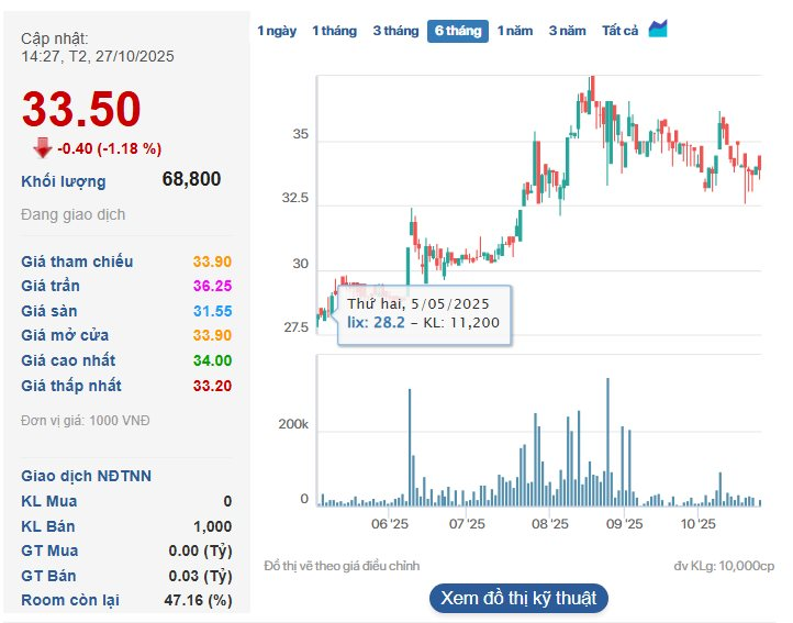 Trên thị trường chứng khoán, cổ phiếu LIX đã có một nhịp tăng đáng kể từ tháng 7/2025 và đạt đỉnh ngắn hạn tại vùng giá 36.500 đồng/cổ phiếu vào giữa tháng 8. Kể từ đó, thị giá LIX đã điều chỉnh giảm. Trong phiên giao dịch ngày 27/10/2025, cổ phiếu LIX đang giao dịch quanh mức 33.000-34.000 đồng/cổ phiếu, giảm khoảng 9% so với vùng đỉnh lập hồi tháng 8.