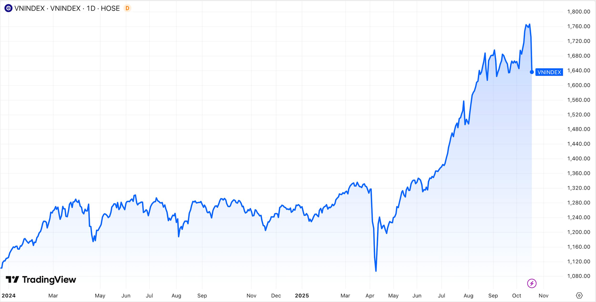 Như vậy, VN-Index đã giảm mạnh 2 phiên liên tiếp với tổng cộng 130 điểm từ vùng đỉnh. Cú rơi thổi bay toàn bộ thành quả tăng giá từ đầu tháng 10. Áp lực chốt lời ngắn hạn có lẽ là một trong những nguyên nhân khiến thị trường giảm mạnh. Bên cạnh đó, khối ngoại cũng tiếp tục bán ròng khoảng 2.000 tỷ gây thêm áp lực lên thị trường.