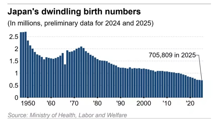 Theo Bộ Y tế, Lao động và Phúc lợi Nhật Bản, số trẻ sinh ra trong năm 2025 giảm 2,1% so với năm trước, xuống còn 705.809 trẻ. Đây là năm thứ 10 liên tiếp ghi nhận mức thấp kỷ lục kể từ khi nước này bắt đầu thống kê vào năm 1899. Trong 10 năm qua, số ca sinh đã giảm tới 30%.