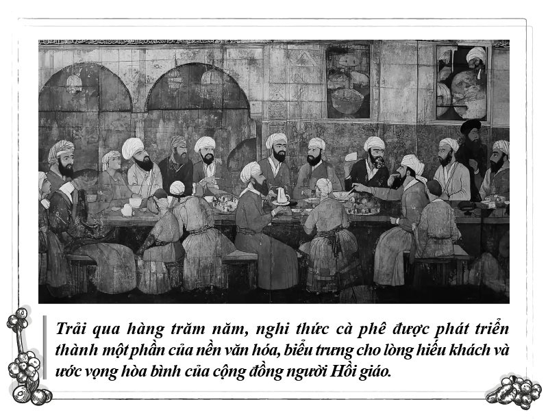 Trong đời sống thế tục của thế giới Hồi giáo, nghi thức cà phê trở thành biểu tượng của lòng hiếu khách, sự hào phóng và ước vọng hòa bình. Tại Ả Rập, trong nghi lễ tiếp đón khách, chủ nhà chọn lọc nguyên liệu cà phê tỉ mỉ, thực hiện các nghi thức pha chế trang trọng và cùng cầu nguyện đấng Allah rồi cùng thưởng thức cà phê trong không gian Majlis – nơi đặc biệt để trao đổi kiến thức và thảo luận chuyện gia đình, cộng đồng… Mỗi vị khách được mời ba cốc cà phê. Cốc thứ nhất là al-dhaif, đại diện cho hòa bình. Cốc thứ hai gọi là al-kaif, mang ý nghĩa thiết lập tình bạn. Cốc thứ ba gọi là al-saif, tượng trưng cho lòng trung thành và sự bảo vệ.