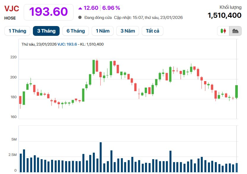 Trái ngược với diễn biến tiêu cực của thị trường chung, cổ phiếu VJC trở thành điểm sáng hiếm hoi khi duy trì sắc tím đến hết phiên, đóng cửa tại mức 193.600 đồng/cổ phiếu, tăng 6,96% so với tham chiếu.