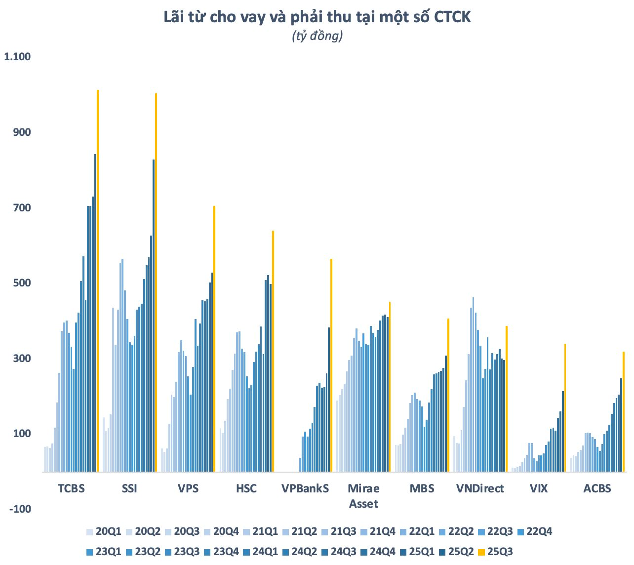 Quý 3/2025, toàn thị trường ghi nhận 25 CTCK có nguồn thu từ hoạt động cho vay trên 100 tỷ. Đáng chú ý, 10 CTCK dẫn đầu đều có lãi từ cho vay và phải thu trên 300 tỷ đồng trong quý 3. Đây là con số kỷ lục từ trước đến nay. Đặc biệt, bộ đôi có dư nợ margin lớn nhất thị trường là TCBS và SSI thậm chí còn thu lãi hơn nghìn tỷ từ hoạt động cho vay.