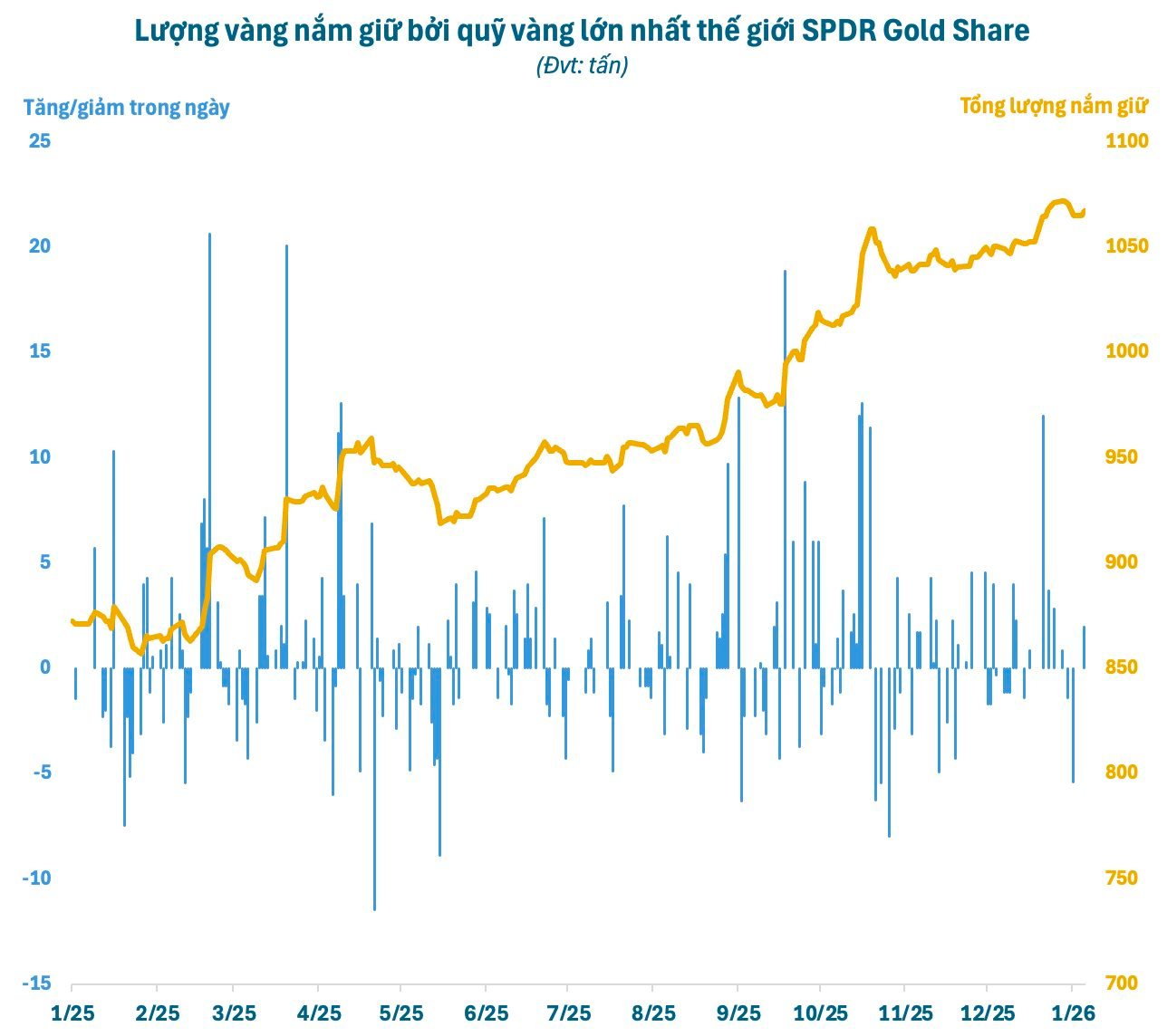 Thực tế, giá vàng cũng đang chững lại gần vùng đỉnh lịch sử dù quỹ đầu tư hàng đầu thế giới vẫn đang miệt mài mua vào. Tổng lượng vàng nắm giữ bởi các quỹ ETF trên toàn cầu hiện vào khoảng 4 nghìn tấn, ước tính khoảng 600 tỷ USD. Riêng quỹ vàng lớn nhất thế giới SPDR Gold Share đã mua thêm gần 200 tấn trong một năm trở lại đây, qua đó nâng tổng lượng nắm giữ lên hơn 1 nghìn tấn.