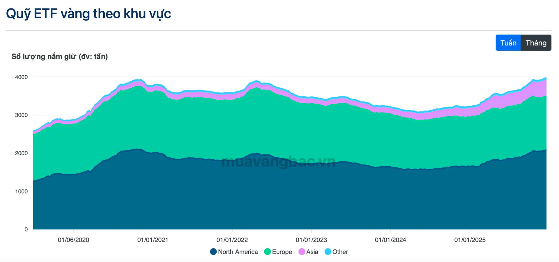 Xét theo khu vực, các quỹ đến từ Bắc Mỹ và Châu Âu vẫn nắm nhiều vàng nhất với khối lượng lần lượt khoảng 2 nghìn tấn và 1,4 nghìn tấn. Tuy nhiên, các quỹ Châu Á cũng đang nổi lên trở thành “tay chơi” đáng gờm khi liên tục mua mạnh để nâng tổng lượng vàng nắm giữ lên gần gấp đôi thời điểm đầu năm ngoái.