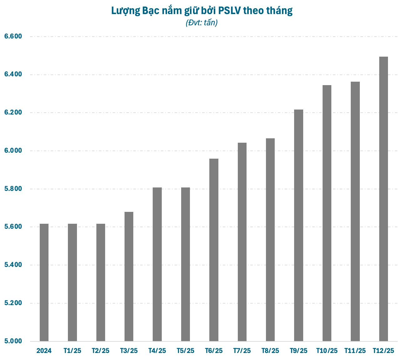 Một quỹ đầu tư lớn khác là Sprott Physical Silver Trust USD (PSLV) cũng mạnh tay mua thêm khoảng 28 triệu oz bạc (gần 900 tấn) trong năm 2025. Tính đến cuối năm 2025, quỹ đang nắm gần 209 triệu oz bạc (~6,5 nghìn tấn), tương đương quy mô tài sản hơn 17,3 tỷ USD. PSLV là một trong những quỹ bạc vật chất lớn nhất thế giới, đại diện cho triết lý “bạc thật” của Sprott Asset Management LP.