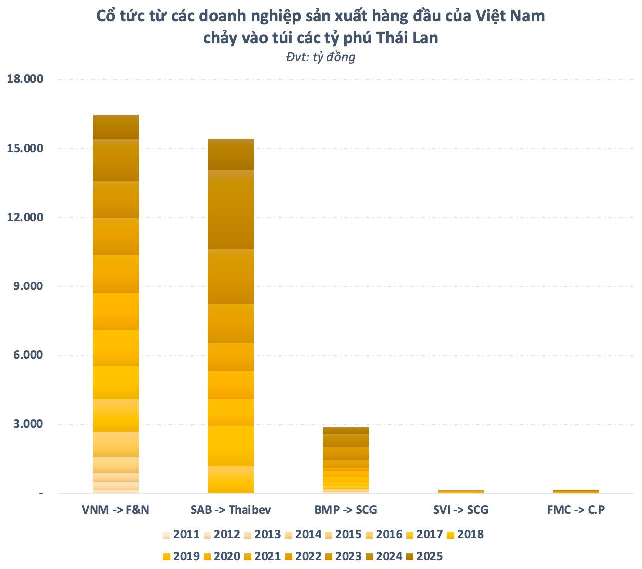 Cuối năm, mùa thu hoạch cổ tức của các tỷ phú Thái Lan lại đến. Các doanh nghiệp đầu ngành của Việt Nam như Vinamilk, Sabeco, Nhựa Bình Minh… dồn dập chi trả cổ tức khủng, hàng nghìn tỷ đồng lại đổ về túi các “đại gia” xứ Chùa Vàng.