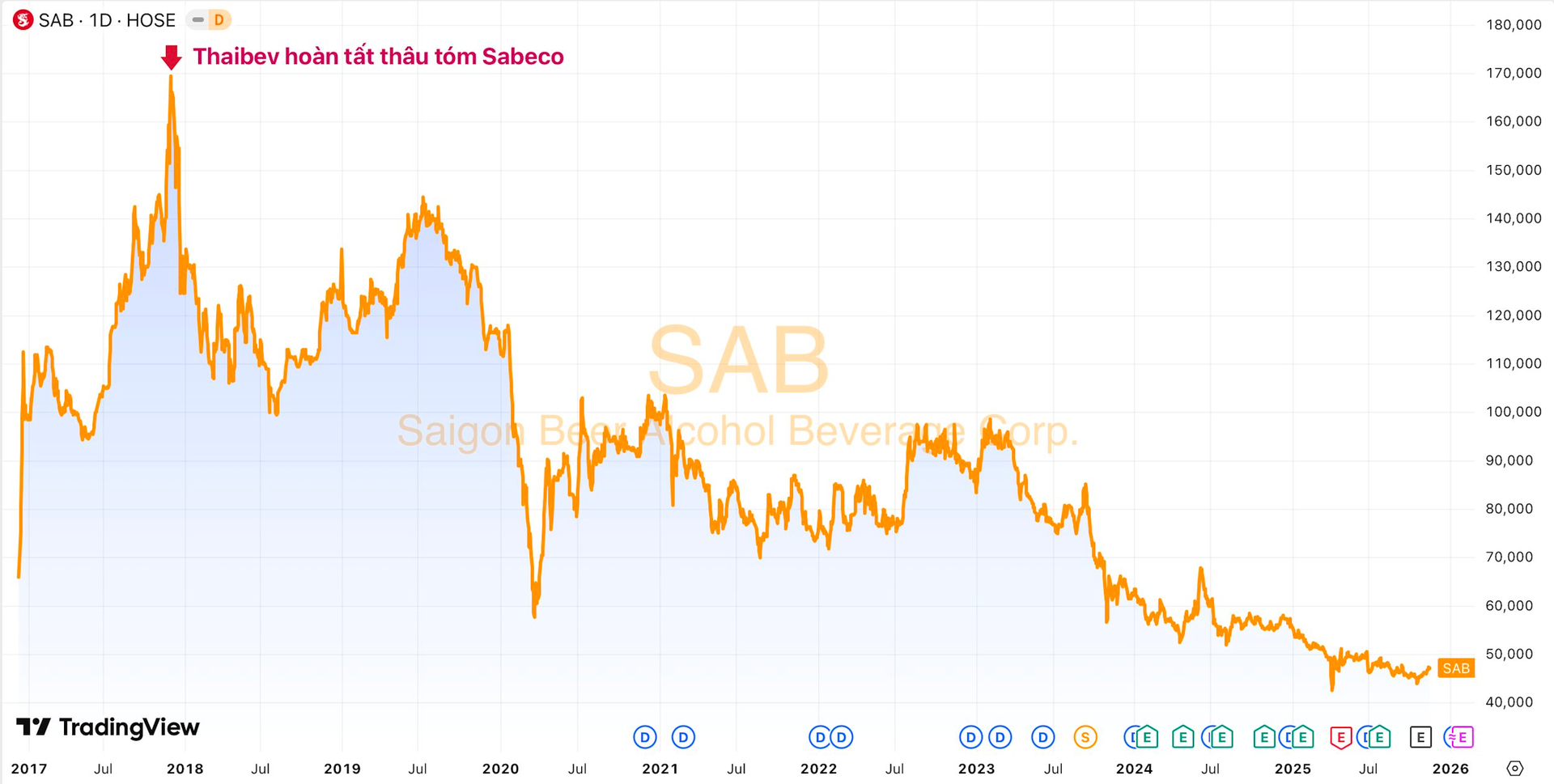 Cuối năm 2017, Vietnam Beverage (thuộc Thaibev của tỷ phú Thái Lan) đã chi đến gần 5 tỷ USD để mua trọn lô 343,66 triệu cổ phiếu SAB (tỷ lệ 53,59%) do Nhà nước thoái vốn, qua đó chính thức nắm quyền chi phối hãng bia lớn nhất Việt Nam. Đây là thương vụ thoái vốn Nhà nước có giá trị lớn nhất trong lịch sử chứng khoán Việt Nam tính đến thời điểm hiện tại.