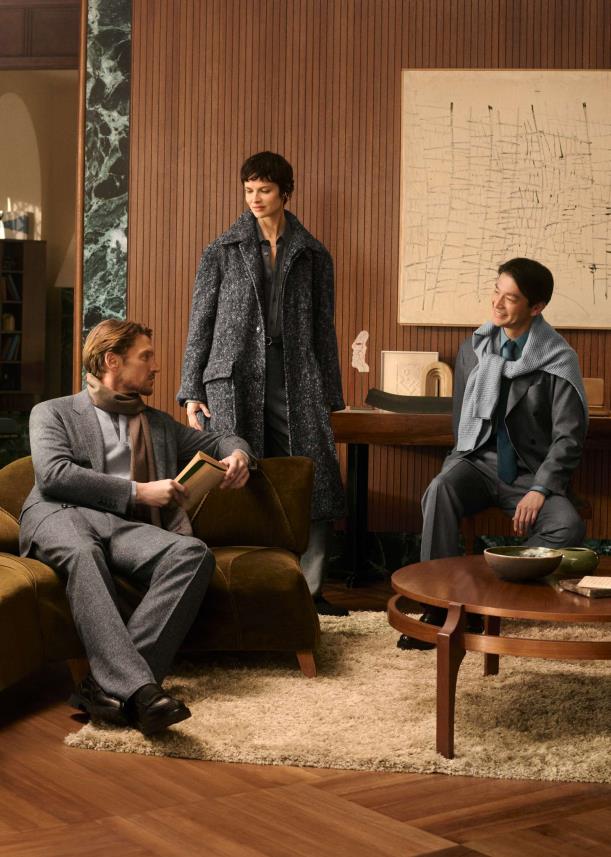 Sự tôn trọng trong bộ sưu tập này được thể hiện qua trải nghiệm xúc giác. Các kỹ thuật dệt may bậc thầy đã mang những kết cấu phong phú, ấm áp của thiết kế nội thất vào tủ đồ: Chất liệu vải phong phú và giàu xúc giác hơn với bouclé, tweed donegal và alpaca mềm mại, gợi nhớ đến kết cấu của một chiếc ghế bành sang trọng. Bảng màu trầm tĩnh và đầy chiều sâu với các sắc thái độc quyền như màu xanh Verde Brianza, Canali Taupe và sự xuất hiện lần đầu của sắc đen tuyền, mang đến một lớp vỏ tinh tế và quyền lực mới.