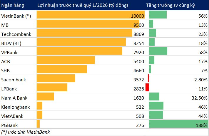 Như vậy, ước tính lợi nhuận trước thuế quý 1/2026 của VietinBank có thể sẽ vượt 10 nghìn tỷ đồng.