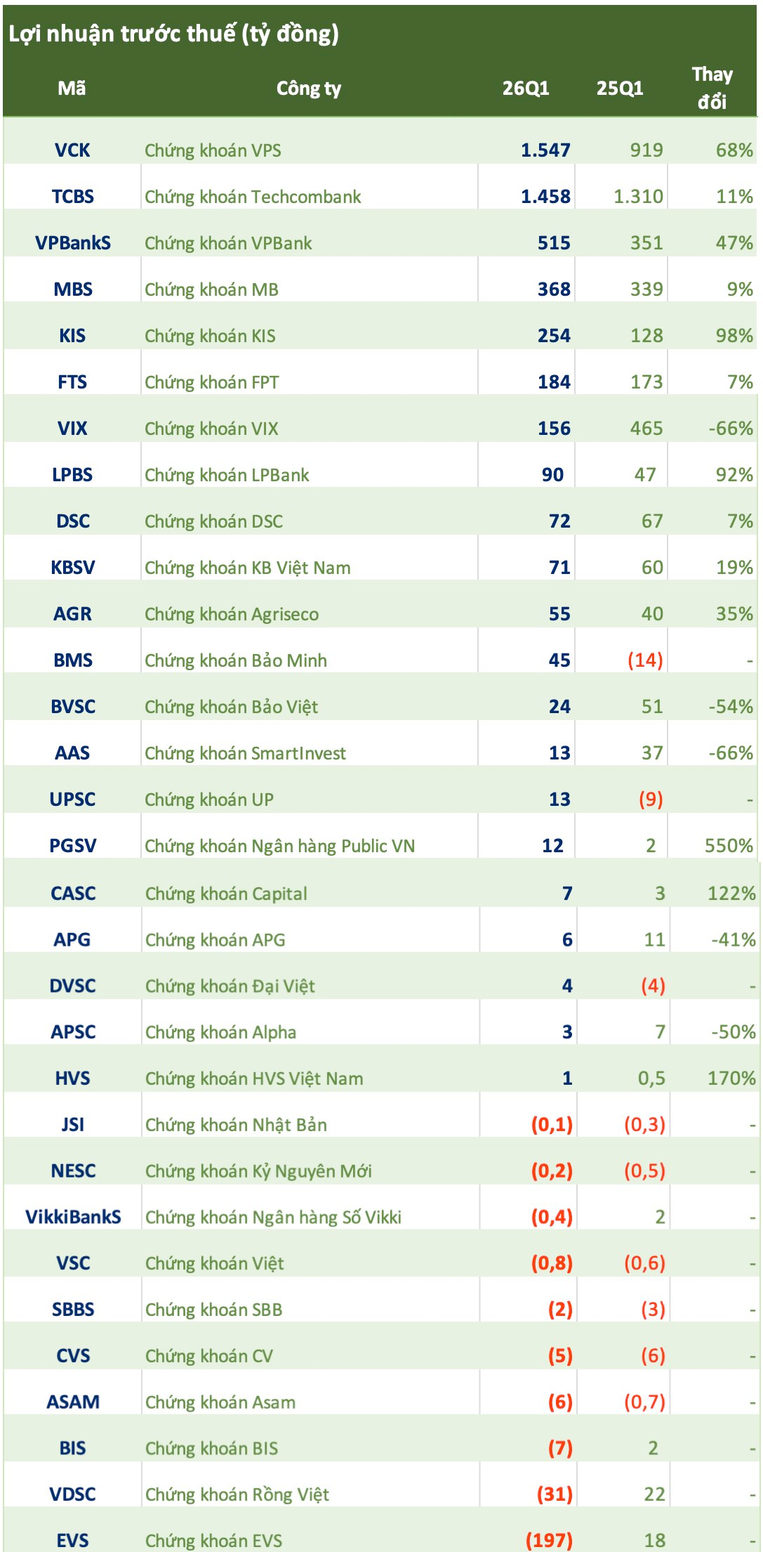 Thậm chí Chứng khoán Rồng Việt (VDSC) báo lỗ 31 tỷ đồng trong quý 1/2026.