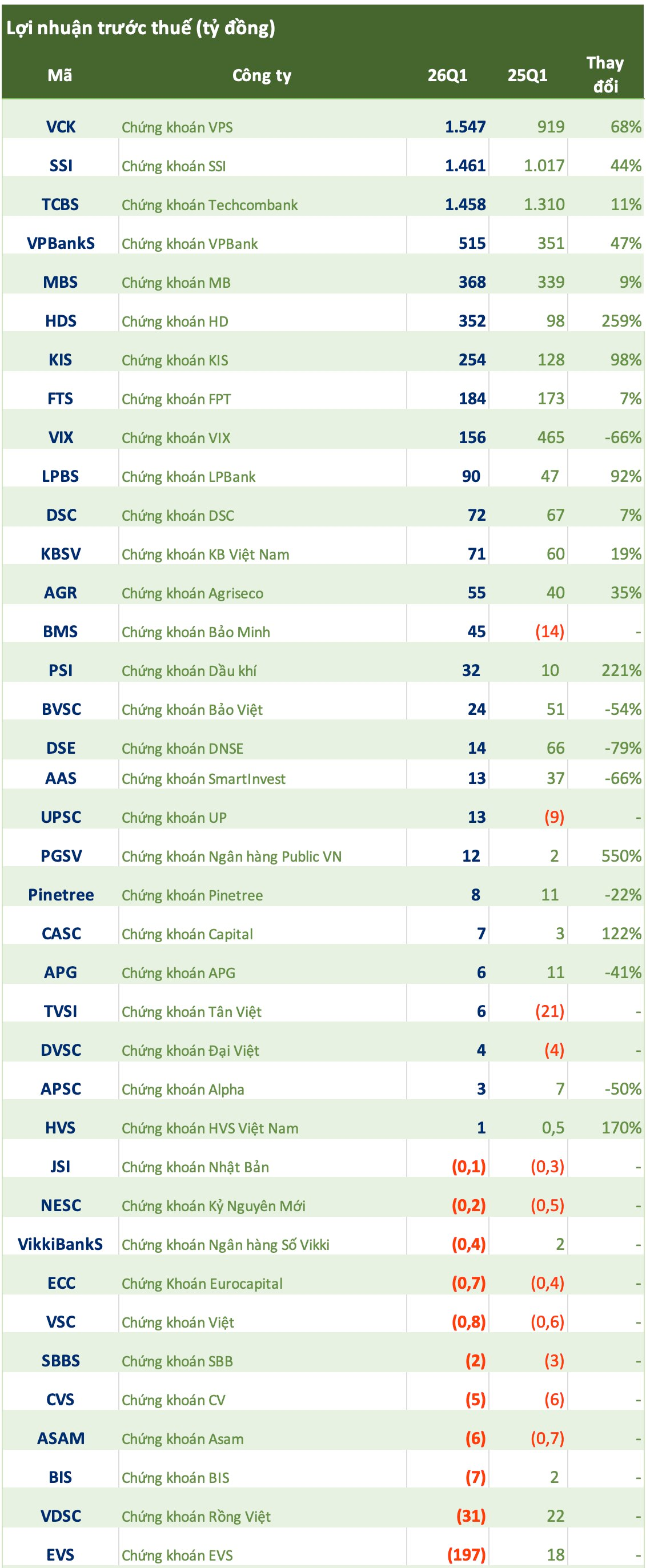 Chứng khoán SSI ghi nhận LNTT hợp nhất quý 1/2026 đạt 1.593 tỷ đồng, tăng trưởng tốt 52% so với cùng kỳ năm trước. Kết quả này giúp CTCK vươn lên vị trí thứ nhất về lợi nhuận ngành chứng khoán trong quý đầu năm.
