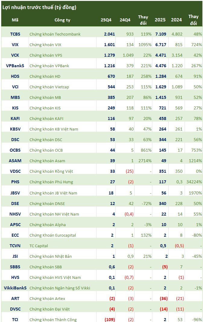 Chứng khoán Vietcap (VCI) cũng đã hé lộ bức tranh kinh doanh năm 2025. Riêng trong quý 4, doanh thu hoạt động đạt 1.526 tỷ đồng, gấp rưỡi so với cùng kỳ. Lãi từ các tài sản FVTPL tăng mạnh lên 750 tỷ đồng do hiện thực hóa lợi nhuận từ một số khoản đầu tư. Bên cạnh đó, lãi từ cho vay và phải thu tăng 49% lên 376 tỷ, kết quả lợi nhuận trước thuế quý 4 của Vietcap đạt 544 tỷ đồng, gấp 2,1 lần con số của quý 4/2024.