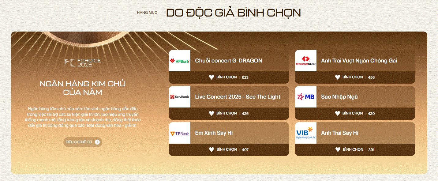 ‏Trong đó, VPBank lại nổi bật theo cách riêng. Bước vào mùa bình chọn năm nay, ngân hàng này được cộng đồng nhắc đến với hai "cú nổ" truyền thông gây chú ý mạnh mẽ: Đại nhạc hội K Spark Star và đặc biệt là hai đêm concert của G-Dragon tại Hà Nội. Cả hai sự kiện này đều tạo thành cơn sốt vé thực sự trong năm.‏