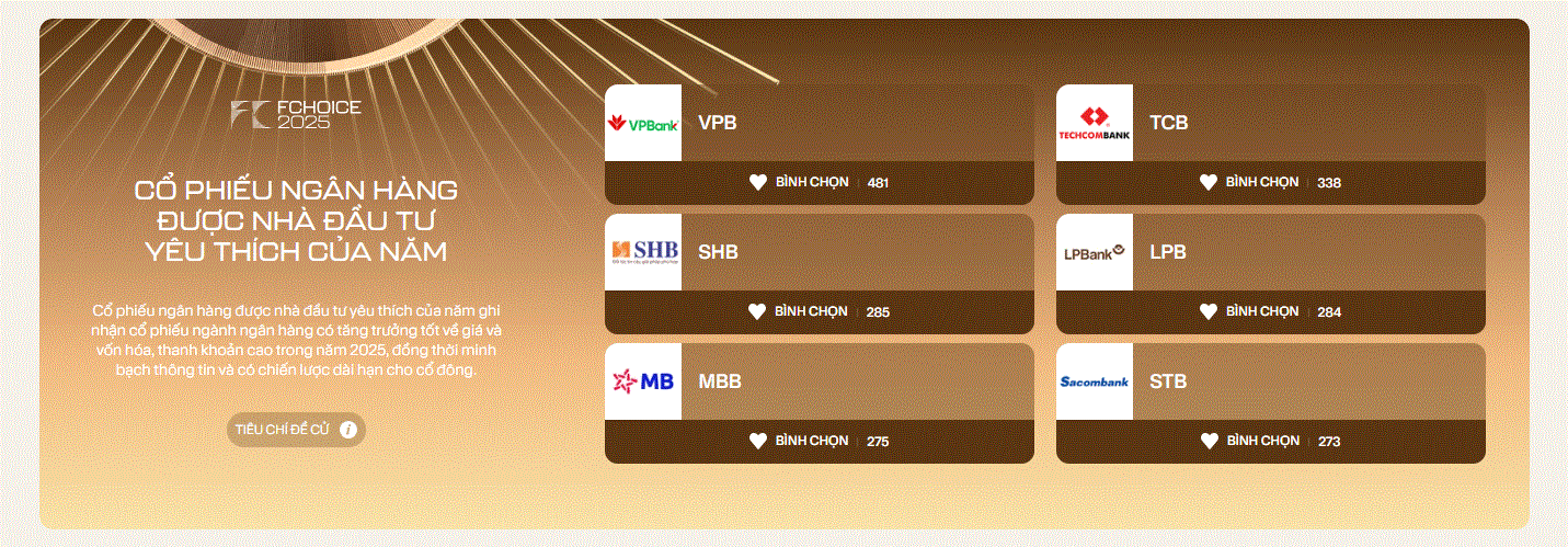 ‏Còn “Cổ phiếu ngân hàng được nhà đầu tư yêu thích của năm” là thước đo niềm tin của thị trường, phản ánh sự hấp dẫn của cổ phiếu dựa trên tăng trưởng giá, thanh khoản và chiến lược dài hạn.