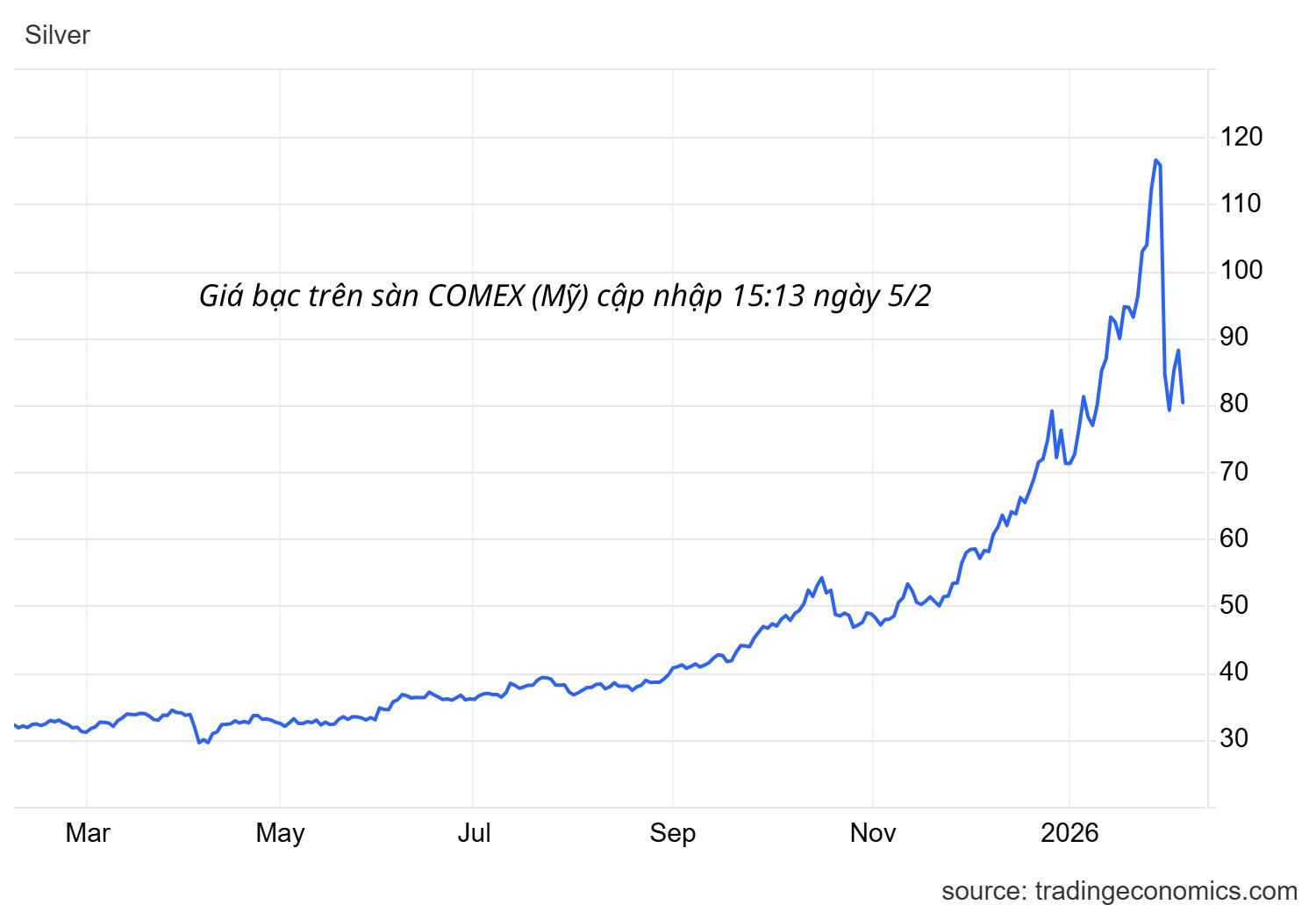 Trên sàn COMEX (Mỹ), giá bạc cũng giảm sâu gần 9%, xuống vùng 80 USD/ounce, chênh lệch với giá tại Thượng Hải thu hẹp xuống còn khoảng 8 USD/ounce.